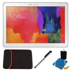 Bundle includes: Galaxy Note Pro 12.2" White 64GB Tablet 13" Sleeve for Tablets Universal Touch Screen Stylus Pen with Pocket Clip 3pc. Lens Cleaning Kit Take It All In View stunning, lifelike detail and brilliant color on the new 12.2" crystal clear HD display with over 4 million pixels packed inside. It's also astonishingly lightweight at just 1.65 pounds, yet delivers an unrivaled reading, editing and viewing experience, and incredible responsiveness-all powered by the Samsung Exynos 5 Octa processor. More Power. More Control. Take your productivity to the next level on the large 12.2-inch display with the intuitive S Pen and enhanced multitasking, which allows you to use four different applications side-by-side. And stay more organized with Magazine Home, a home screen full of dashboards that update automatically. Now you can get to your favorite apps even easier with Bezel Slide. Simply swipe your thumb near the edge of the tablet to select your app. Your Business Partner Now you can easily take your work with you wherever you go, with a full-size on-device keyboard and a full suite of office applications for word processing, spreadsheets and presentations. And with Samsung e-Meeting, you can share your screen and collaborate in real time with coworkers, even when Wi-Fi isn't available. And keep all your sensitive information secure with Samsung KNOX, an enterprise-approved security and encryption solution. Owning a Samsung Has Its Rewards With Galaxy Perks, you'll also receive free content and services like a $25 Google Play credit, 3 free months of Hulu Plus, 50GB of Dropbox space, Gogo Inflight Internet access and more. Specifications Category - Tablet Form Factor - Touchscreen Color - Black OS - Android KitKat 4.4 Size - Weight: 1.65 lb. - Product Dimensions: 11.64" x 8.03" x 0.33" Camera - Camera resolution (front) : 2.0 Megapixel - Camera resolution (rear) : 8.0 Megapixel with Flash - Digital Optical Zoom: 4x Digital - Features: Auto Focus; Dual-Camera; Dual-Recording; Dual-Video Call; Geo-Tagging; HD Playback; HD Recording; LED Flash; Online Image Uploading; Photo Editing; Sharing Capabilities: Bluetooth, Dropbox, Email, e-Meeting, Flipboard, Gmail, Google+, Google Drive, Hangouts, Photos, Remote PC, Samsung Link; Shot Modes: Beauty, Panorama, Night, Landscape, Single, Sound Shot, Sport; TV/Video-Out: HDMI, Samsung Link, Wi-Fi Direct, Wi-Fi; Video; Video Editing; Zero Shutter Lag Battery - Battery Type and Size: 3.8 Volt, Li-ion Polymer, 9500 mAh - Music Play Time: Up to 131 hours - Video Play Time: Up to 11 hours - Internet Use Time: Up to 13 hours Memory - Internal Memory: 3GB RAM; 64GB ROM (Portion of memory occupied by existing content) - External Memory/microSD Capacity: Up to 64 GB