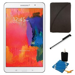 Bundle includes: Galaxy Tab Pro 8.4" White 16GB Tablet 10" Sleeve for Tablets Universal Touch Screen Stylus Pen with Pocket Clip 3pc. Lens Cleaning Kit See More. Carry Less. Experience stunning HD with over 4 million pixels, packed into an 8.4-inch display. The Galaxy Tab Pro also features an incredibly powerful Quad-Core Processor for ultrafast responsiveness, all inside a thin and lightweight design. New Experience Multi Window lets you actively use two windows at once. Watch a movie and answer email, or search the Web and edit a presentation, all at the same time. And with Magazine Home, you can customize multiple dashboards to stay organized and prioritize your most useful apps and feeds. Productivity Anywhere Turn anyplace into a workspace with Samsung e-Meeting and the easy-to-use Hancom Office Suite. Samsung e-Meeting lets you share your screen with coworkers without Wi-Fi, while Hancom Office Suite gives you the ability to create and edit documents, spreadsheets and presentations on the go. And with the Samsung Mobile Print app, you can print wirelessly to any brand of wireless printer. Owning a Samsung Has Its Rewards With Galaxy Perks, you'll also receive free content and services like a $25 Google Play credit, 3 free months of Hulu Plus, 50GB of Dropbox space, Gogo Inflight Internet access and more. Specifications Category - Tablet Carrier - Wi-Fi Only Form Factor - Tab, Touchscreen Color - Black OS - Android KitKat 4.4 Size - Weight: 11.67 Oz - Product Dimensions: 5.05" x 8.62" x 0.28" Camera - Camera resolution (front) : 2.0 Megapixel - Camera resolution (rear) : 8.0 Megapixel with Flash - Digital Optical Zoom: 4x Digital - Features: Dual-Camera, Dual-Recording, Dual-Video Call, Geo-Tagging, HD Playback, HD Recording, LED Flash, Online Image Uploading, Photo Editing, Sharing Capabilities: Bluetooth, Dropbox Email, e-Meeting, Flipboard, Gmail, Google+, Google Drive, Hangouts, Photos, Remote PC; Shot Modes: Auto, Sports, Panorama, Eraser, Richtone, Drama, Sound shot, Best face, Best Photo, Beauty face; Video, Video Editing, Zero Shutter Lag Battery - Battery Type and Size: 5.3 Volt, Lithium Ion, 4800 mAh - Music Play Time: Up to 127 hours - Video Play Time: Up to 12 hours - Internet Use Time: Up to 10 hours Memory - Internal Memory: 2 RAM, 16 ROM (Portion of memory occupied by existing content) - External Memory/microSD Capacity: Up to 64 GB - SDHC/SHD SD Card: Built-in MicroSD Card Slot to Add Storage or Transfer Files Connectivity - Bluetooth Profiles: A2DP, AVRCP, DI, HID, HOGP, HSP, OPP, PAN; MHL Support - Dual-Band Wi-Fi 802.11 a/b/g/n/ac, - USB USB 2.0 - Bluetooth 4.0 LE CPU - Processor Speed, Type: 2.3 GHz Qua